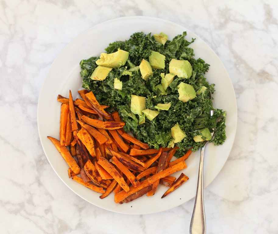 - Avocado Kale Caesar Salad with Sweet Potato Fries via Pinch of Yum