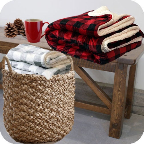 My Favorites: Plaid Sherpa Throw / UltraLux Plush Blanket (great reviews, lots of color options and only $27) / Monogramed Sherpa Blanket / Solid Cable Knit Chenille Sherpa Throw (I love the knit on one side of this Target sherpa throw, plus it looks just like this Pottery Barn version we have that is $100+ that we love!)