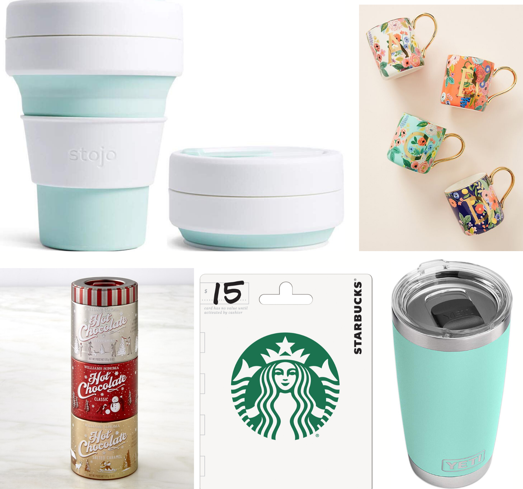 Mug Favorites: Stojo Collapsible Travel Cup (awesome for those who like their coffee on the go but don’t want to cart around a big tumbler when they’re done) / Yeti Travel Tumbler / Anthropologie Garden Party Mug