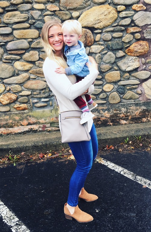 A few of you asked for details from the oversize cozy sweater outfit I work during our mountain vacation so I wanted to break everything down for you here! The sweater was actually a recent StitchFix delivery “keep” so definitely request it if you’re a regular StitchFixer! (It’s the RD Style Rowca Scoop Neck Pull Over Sweater.) It has a high-low hem and covers the booty so it’s great to pair with leggings as well. The crossbody purse is Marc Jacobs and I LOVE it. Such a versatile color (I have it in “Mink”) and it’s big enough to hold a diaper and a small pack of wipes, a few snacks, lip gloss and my card case. Win! I bought it on sale through RueLaLa but it’s also available on Zappos! My jeans are actually a couple years old from White Plum but they don’t appear to sell them anymore. The booties have been a TILF feature in the past because they were pretty cheap but ended up being my go-to bootie last fall and winter. They’re also crazy comfy and I can honestly walk miles in them. The brand is Fergalicious (I know… haha!) but the cognac color I am wearing seems to be sold out almost everywhere. I managed to find them on DSW’s website in a taupe/gray color I almost like more though and they still have most sizes!