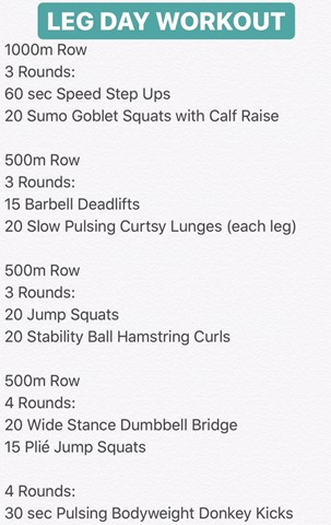 In the end, I completed a lower body workout with bursts of rowing included that looked like this: