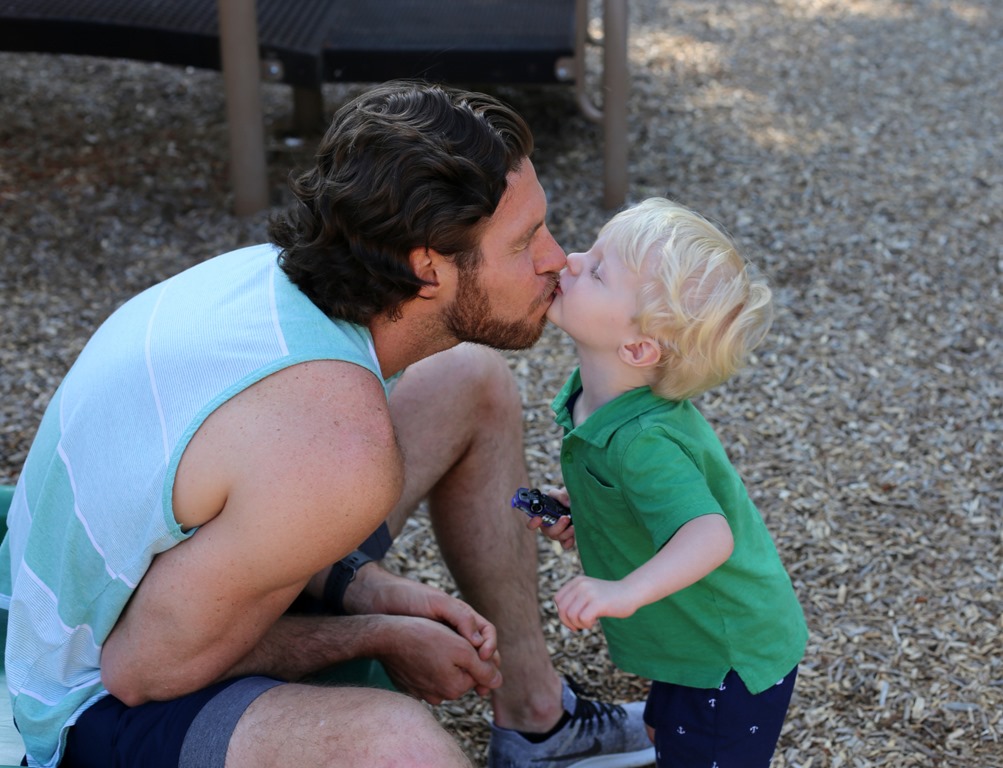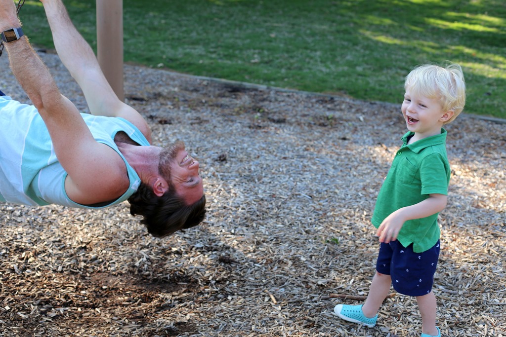 Evenings when Ryan gets home early enough to join us for some outdoor activities are my absolute favorite – and Chase’s, too! He had a blast pushing Dad on the swings, exploring the tree-lined paths at the park and sneaking around the playground to “scare” me. He also loves “catching” Ryan whenever Ryan slides down a slide after him which is way too adorable.