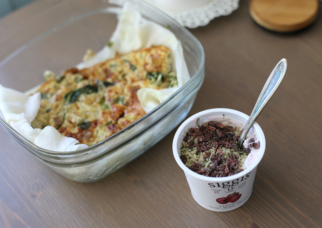 My lunch for the day included the final two pieces of a frittata I made earlier in the week along with a cup of yogurt topped with cacao nibs and hemp seeds… plus a small bowl of Rice Chex about 30 minutes later.