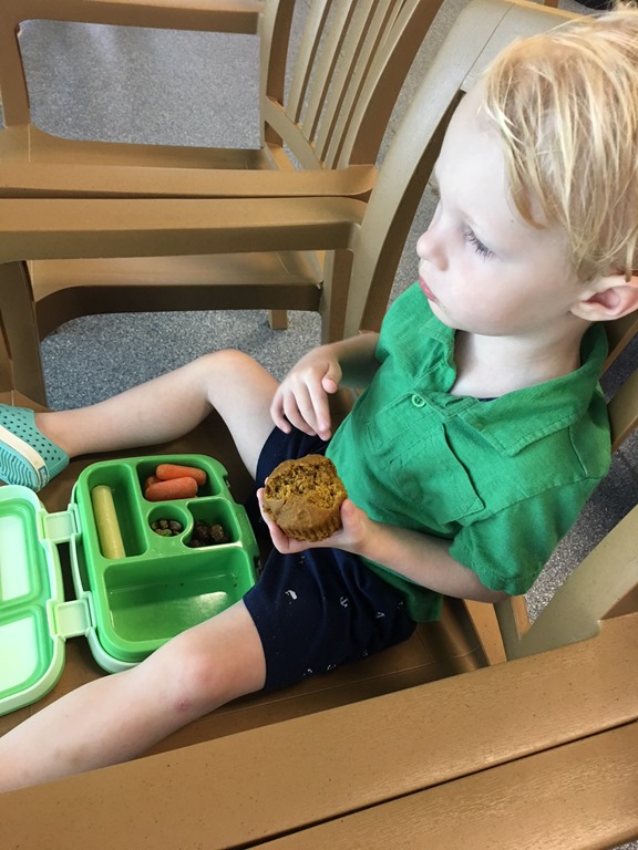 It’s not a bad way to go because sometimes trying to coerce him into sitting still for lunch is a bit of a battle in our house, so this has proven to be a great way to get lunch in his belly before we arrive back home and his toys and playtime distract him.