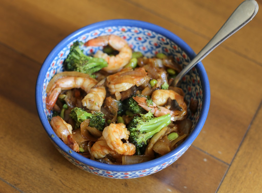 While Chase ate his lunch, I used the roasted broccoli we made together in a stir fry for myself that included onions, mushrooms, edamame and shrimp prepared in a sauce I modeled after this garlic ginger stir fry sauce from Pinch of Yum.