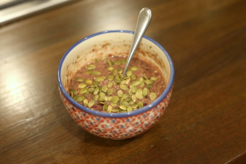 My morning began at 5 a.m. when I made a batch of superseed oatmeal. My random concoction was inspired by a hybrid of recipes from the How Not to Die Cookbook that I created in an effort to incorporate a bunch of Dr. Greger’s Daily Dozen foods (aka the foods he says we should strive to eat daily for optimal health) into one bowl. I’ve been making this particular combination regularly and loving it. It’s packed with flaxseeds, chia seeds, oats, cacao nibs, berries and cinnamon and tastes great!