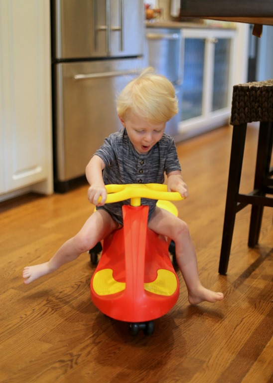 Once Chase was awake, we eased into the morning by curling up in his room with a few library books before digging into whole wheat pumpkin muffins and a banana. With breakfast in his belly, Chase was ready to rock and kicked off morning playtime with some pants-free toy car driving!