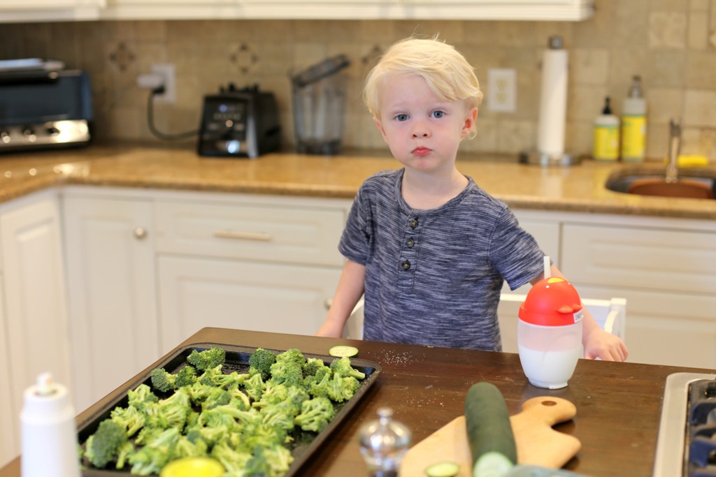 After swimming, we headed home and Chase played with his toys while I did a little food prep. Chase eventually asked to join in the cooking fun so we roasted some broccoli and sliced a few veggies to have on hand for the week ahead.