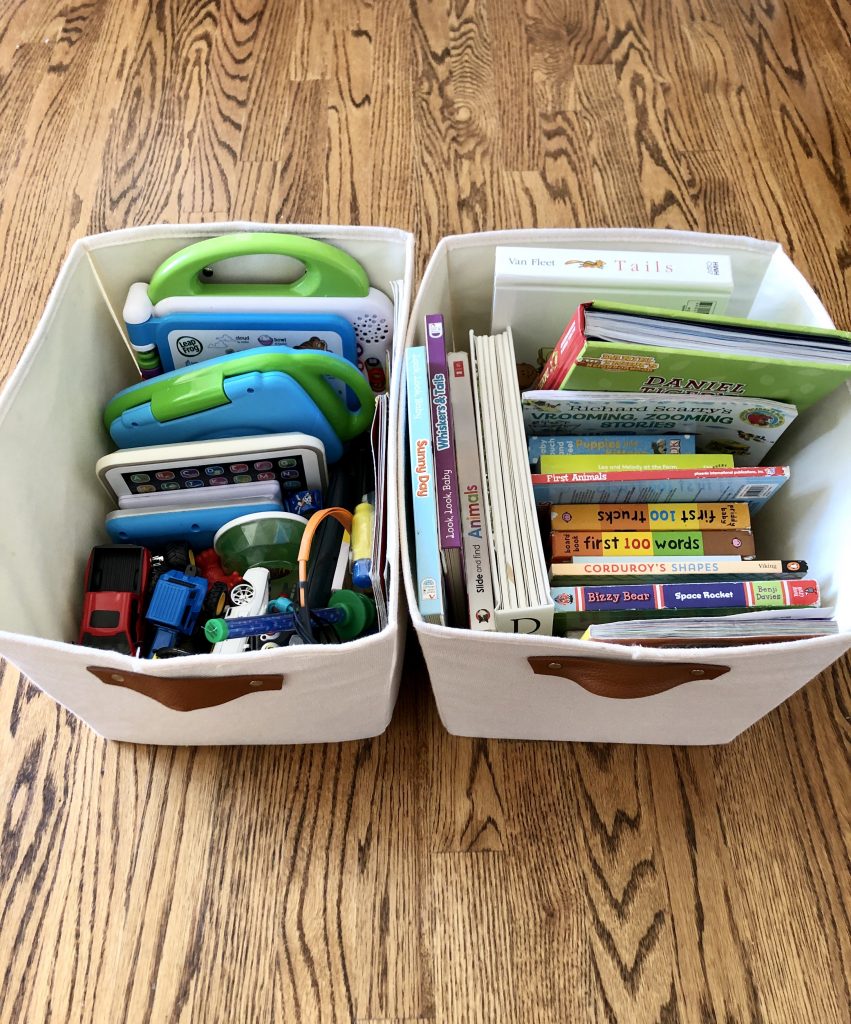 I grabbed two bins from Target in a color that would semi-closely match the interior of my car (a tan leather) and also fit between the boys’ two car seats. (I drive a small SUV.) You guys, as simple as this system is, it WORKS and my car looks a million times more organized. I keep the toy bin between the boys’ car seats so Chase can easily reach it (Ryder’s arms still aren’t quite long enough) and the book bin sits on the floor in front of the middle seat where I can easily reach it to toss a book back to the boys at a red light. It makes it a million times easier to keep the kids entertained since Ryder is all about books in the car right now and I’m not throwing the same book back to him over and over again because it’s the only one within reach on the messy floorboard of my car. And since I know someone will ask, I looked for exact links to the storage bins I purchased but couldn’t find them online. I highly recommend wandering the aisles of Target or Walmart to find something that you love in a size that works best for your car!