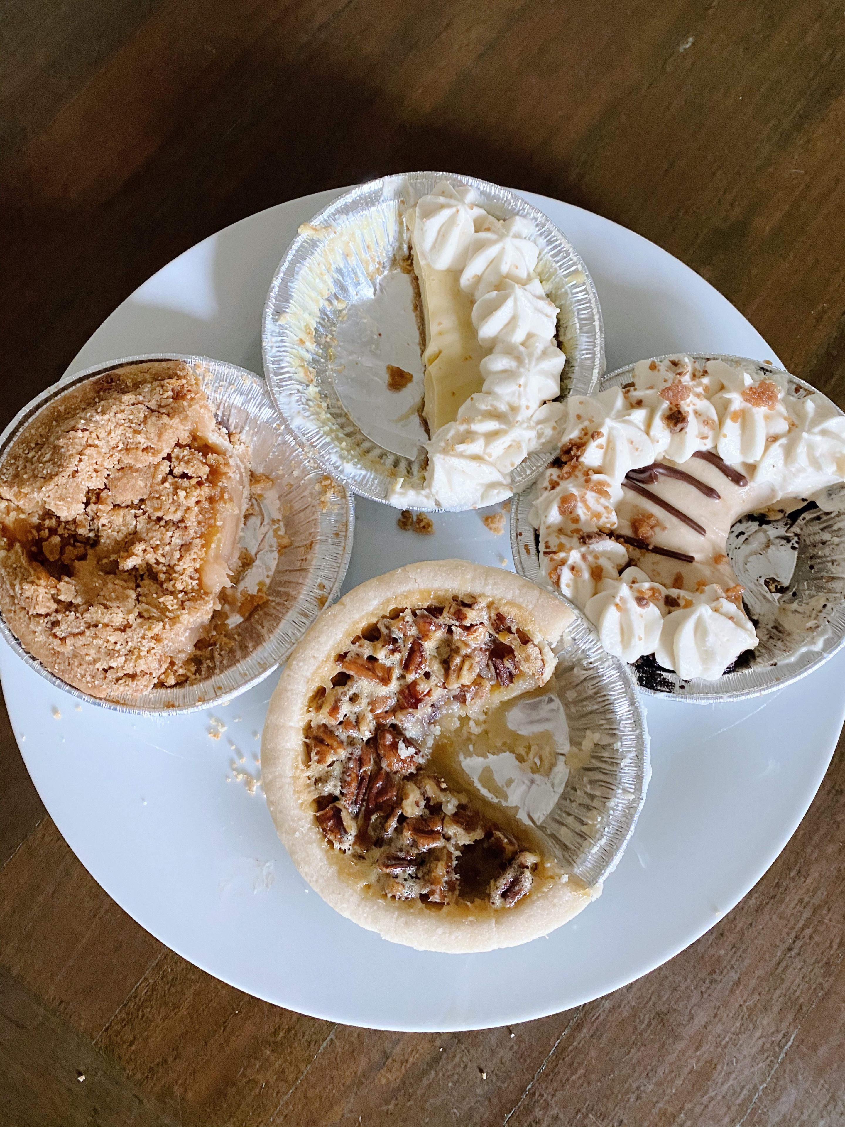 There’s a new pie shop in town! Buttermilk Sky Pie Shop recently opened near us in Birkdale Village and since a sweet tooth runs deep in our family, we were excited to give it a try. Last weekend, we brought home their chocolate cream pie and their apple pie and thought both were delicious. My father-in-law surprised us with a sampler of a few of their mini pies when he stopped by this week so now we’ve tried five flavors from the adorable little shop. My favorite, so far, has been the apple pie thanks to a thick, buttery-sweet crumble topping and a crust that tastes like a traditional flaxy pie crust with a touch of cinnamon sweetness… and almost a hint of shortbread cookie. I don’t know how to explain it but I was lovin’ every bite of that crust!