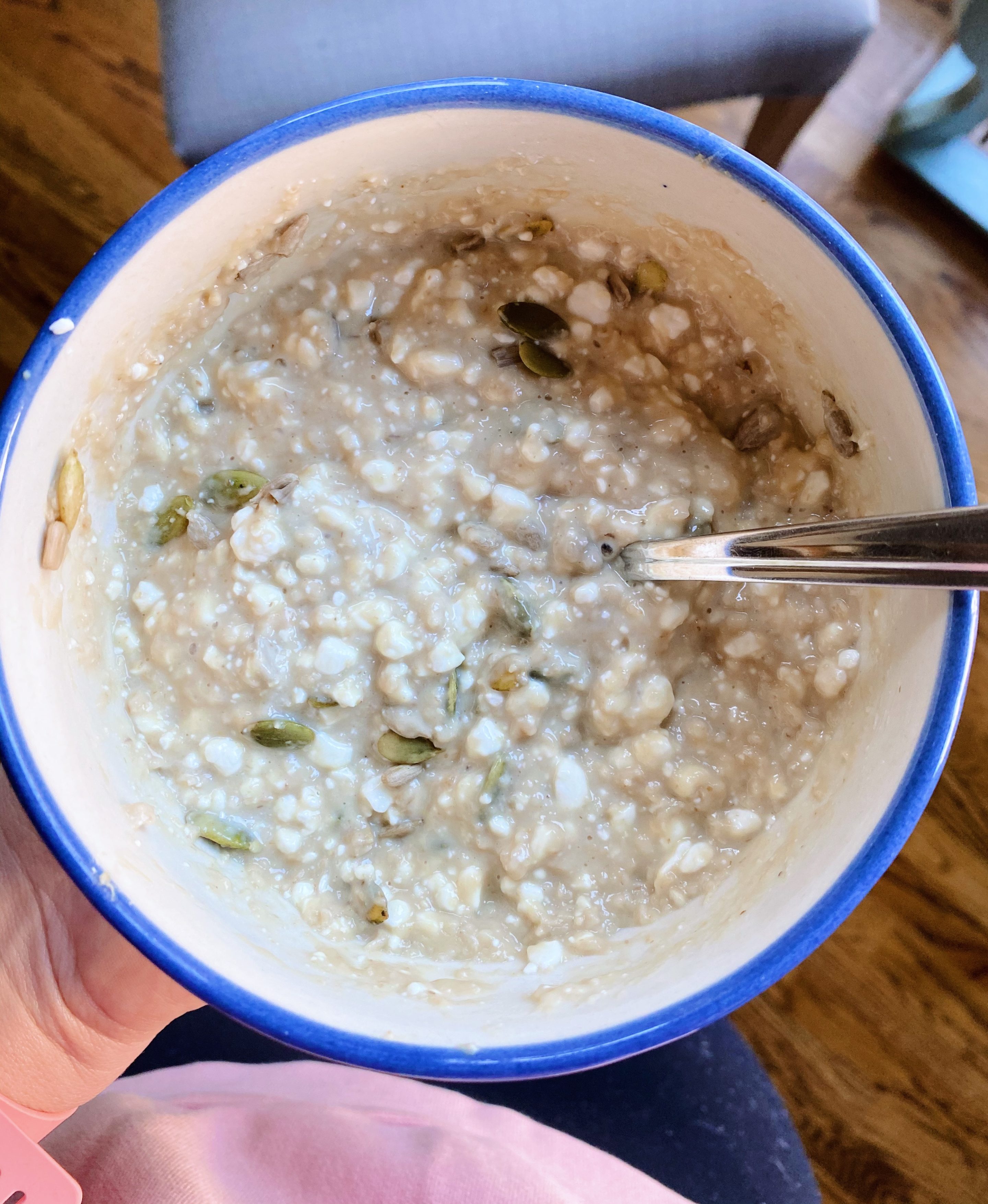 My breakfast: Oat bran with pumpkin seed protein powder, cottage cheese, sunflower seeds, pumpkin seeds and a sprinkle of brown sugar.