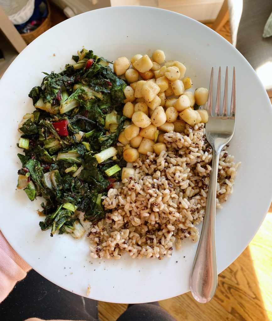 On my plate: Swiss chard and bok choy sautéed in sesame oil with ginger and coconut aminos paired with brown rice and quinoa and bay scallops! YUM. Looks like I’ll be having oatmeal, a smoothie or scrambled eggs for dinner tonight now!