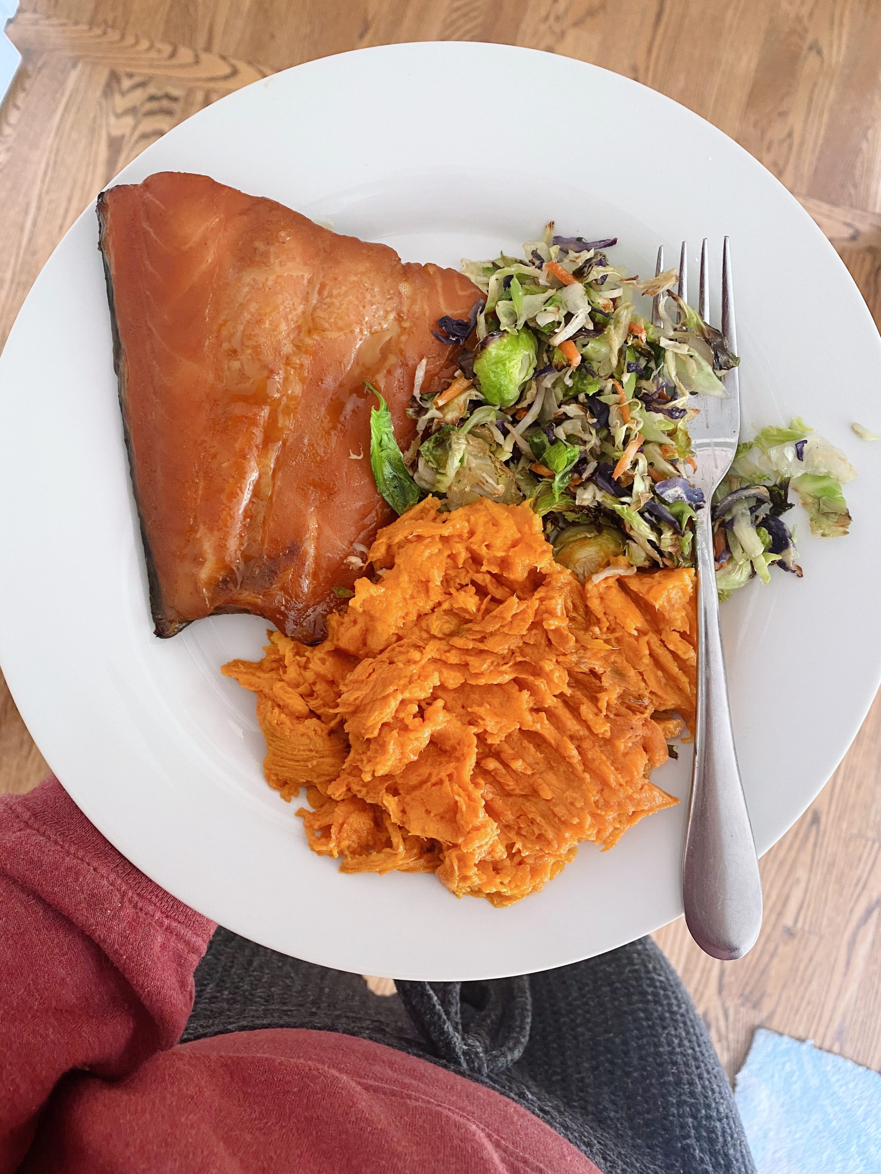 I think this picture reveals the fact that I often meal prep our dinners at lunchtime and reheat them since my salmon looks a little less-than-appetizing but I’ve always loved leftovers and never mind reheated food so it was still a winner in my book! I marinated the salmon in a mix of maple syrup, soy sauce, garlic cloves, ginger and sriracha and it was a big-time winner. For our sides, I mashed up a baked sweet potato and roasted shaved brussels sprouts and a bag of cole slaw mix (shredded cabbage, broccoli and carrots) after tossing the veggies in olive oil, garlic salt and pepper. We’ve been going through a TON of sweet potatoes in our house lately because they’re one of Rhett’s favorite foods at the moment!