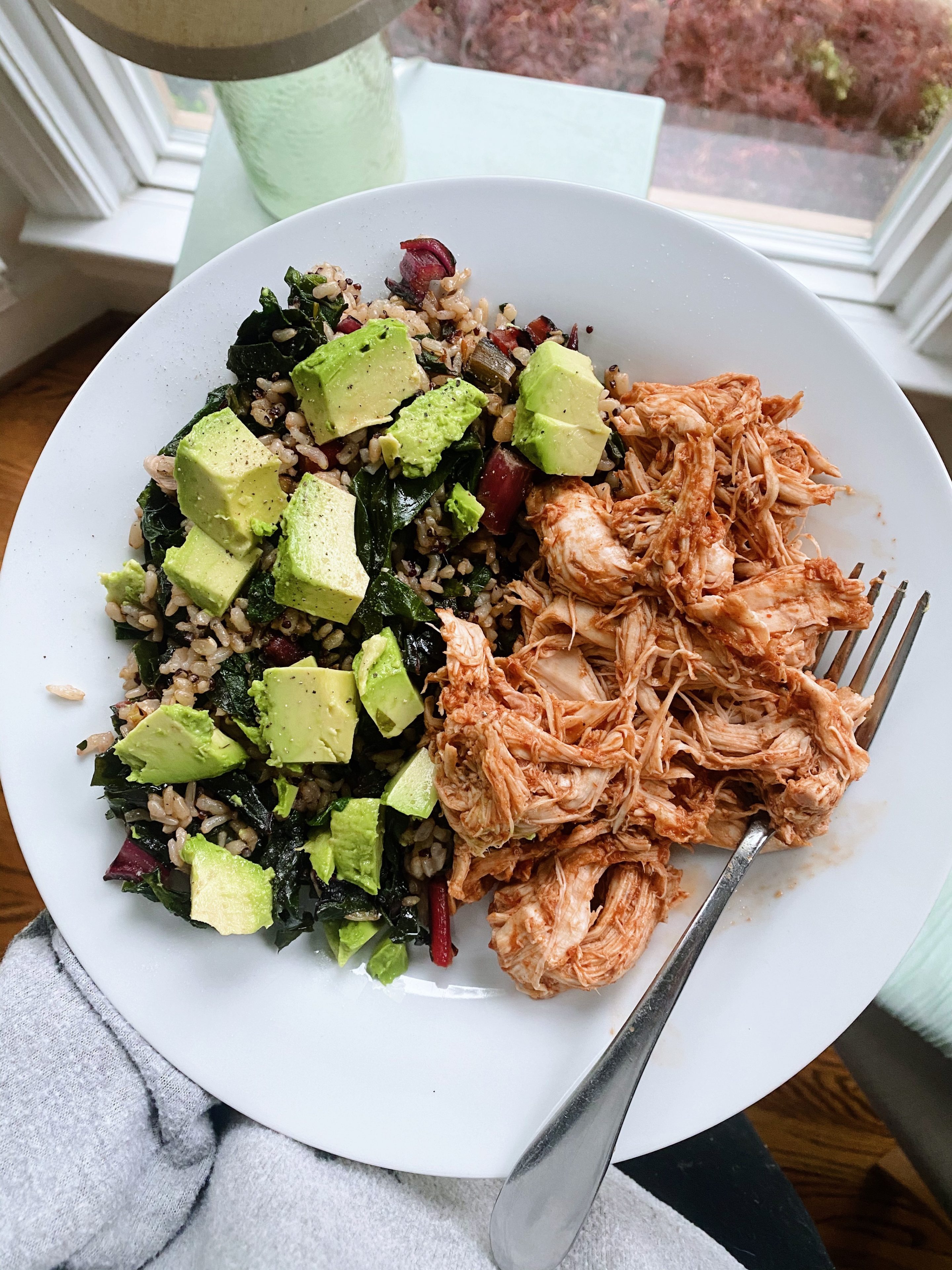 We had some leftover BBQ pulled chicken on hand from BBQ chicken sandwiches that we made over the weekend using this recipe from Ambitious Kitchen and I gave the chicken a new life by pairing it with a rather random but very yummy side dish. I followed the New York Times’ recipe for garlicky swiss chard and then added a pack of ALDI’s Simply Nature 90-second seven grains pouch and topped it with half of an avocado, salt and pepper. It was a random combination but nourishing, filling and delicious.