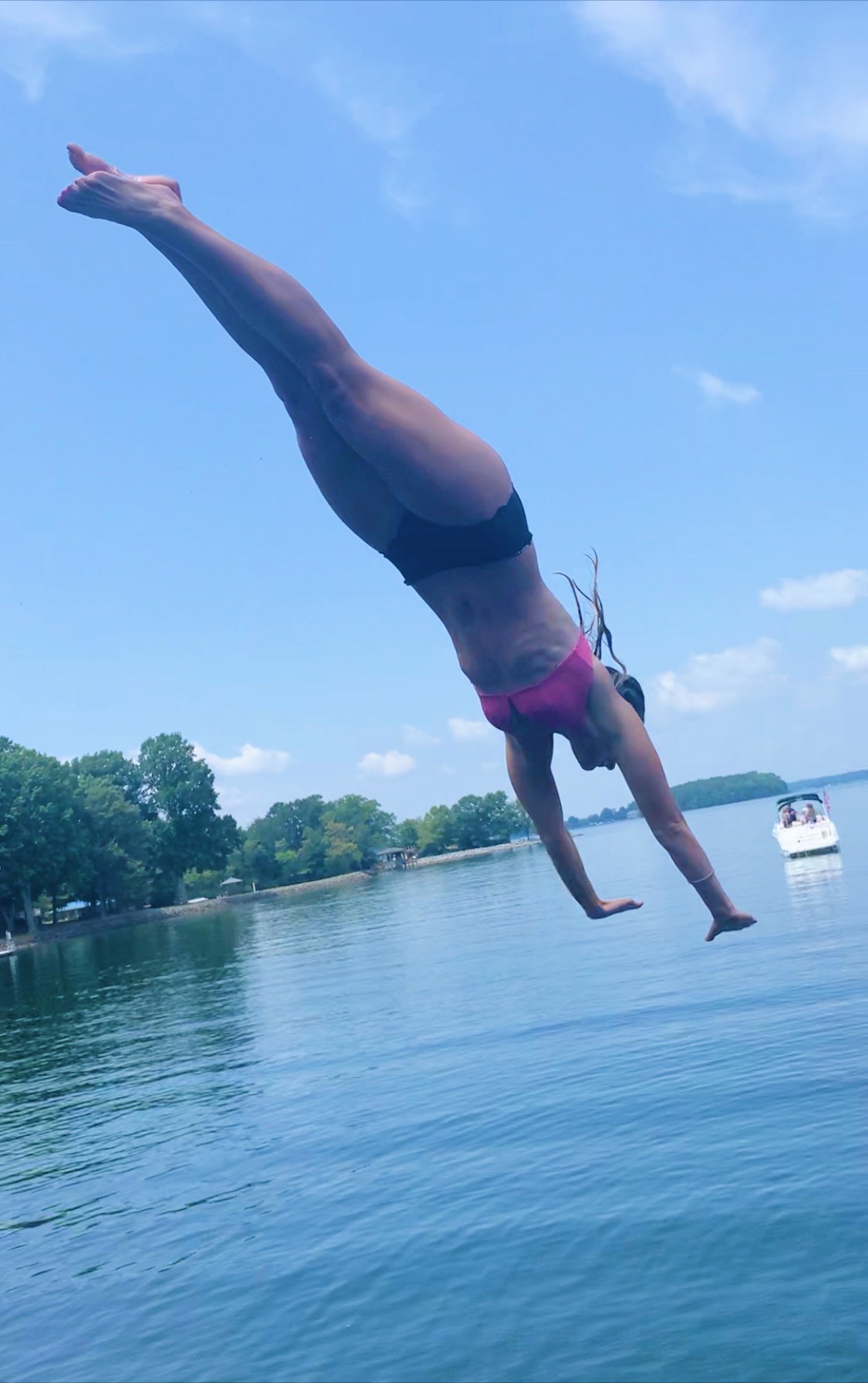 The party was at Carrie’s parents’ house on the lake and it’s seriously a dream, especially during the summertime. They have a little beach and a two-story dock where they dredged 18 feet below the surface so you can safely jump the 18-feet off the dock.