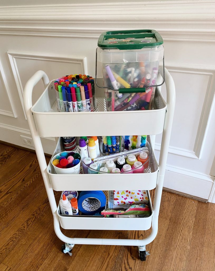 By the time we made it home, we didn’t have time for much else other than a late nap for Rhett, bath time for the kids and bed. I did manage to tackle a few home organization projects during our rockin’ Saturday night though! First up was transforming the rolling cart we used to keep stocked with diapering supplies and newborn essentials when Rhett was in our room into a craft cart for the kids.