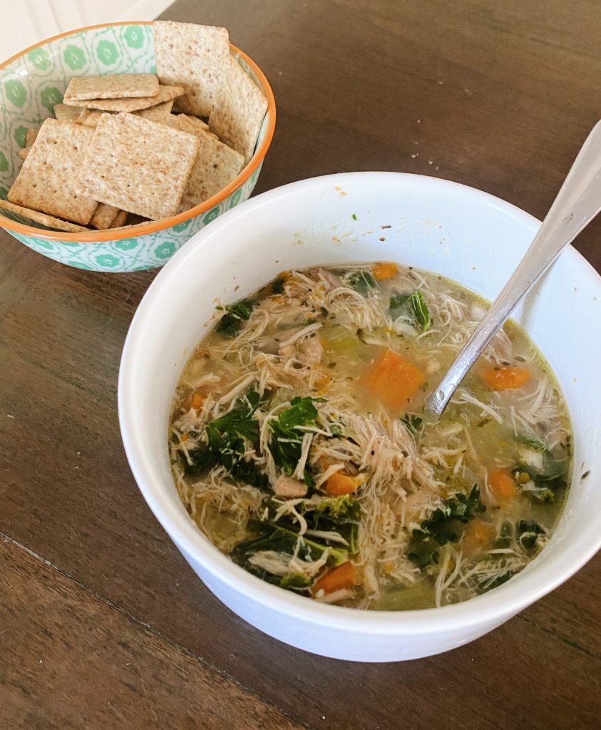 My lunch looked like leftover Instant Pot chicken soup with whole wheat crackers on the side.